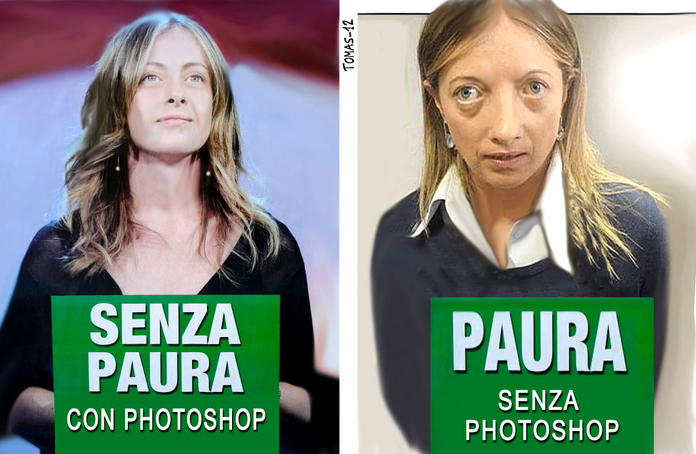 UN PACCO PER L’ELETTORE – Un epic fail notevole, ancora una volta l’abuso del correttore fotografico genera mostri e tutta l’operazione si risolve in un boomerang, almeno per chi trova facile richiamare alla mente la vera immagine di Meloni e notare l’abissale differenza. La domanda che resta sullo sfondo è però quella di chi si chiede se davvero sia necessario per lo donne che fanno politica trasformarsi in top model sui manifesti elettorali, finora solo Berlusconi tra gli uomini ha osato tanto, possibile che abbia ragione chi manipola in questo modo le immagini dei candidati?